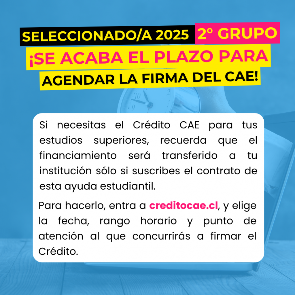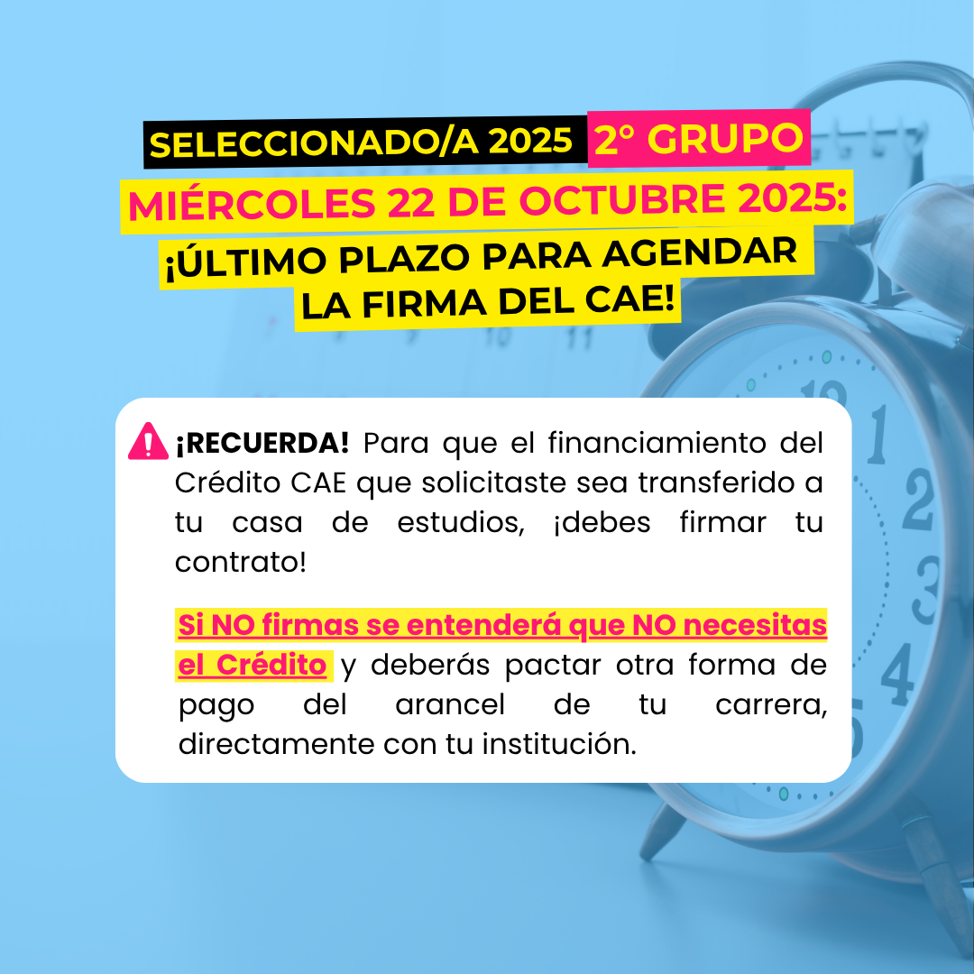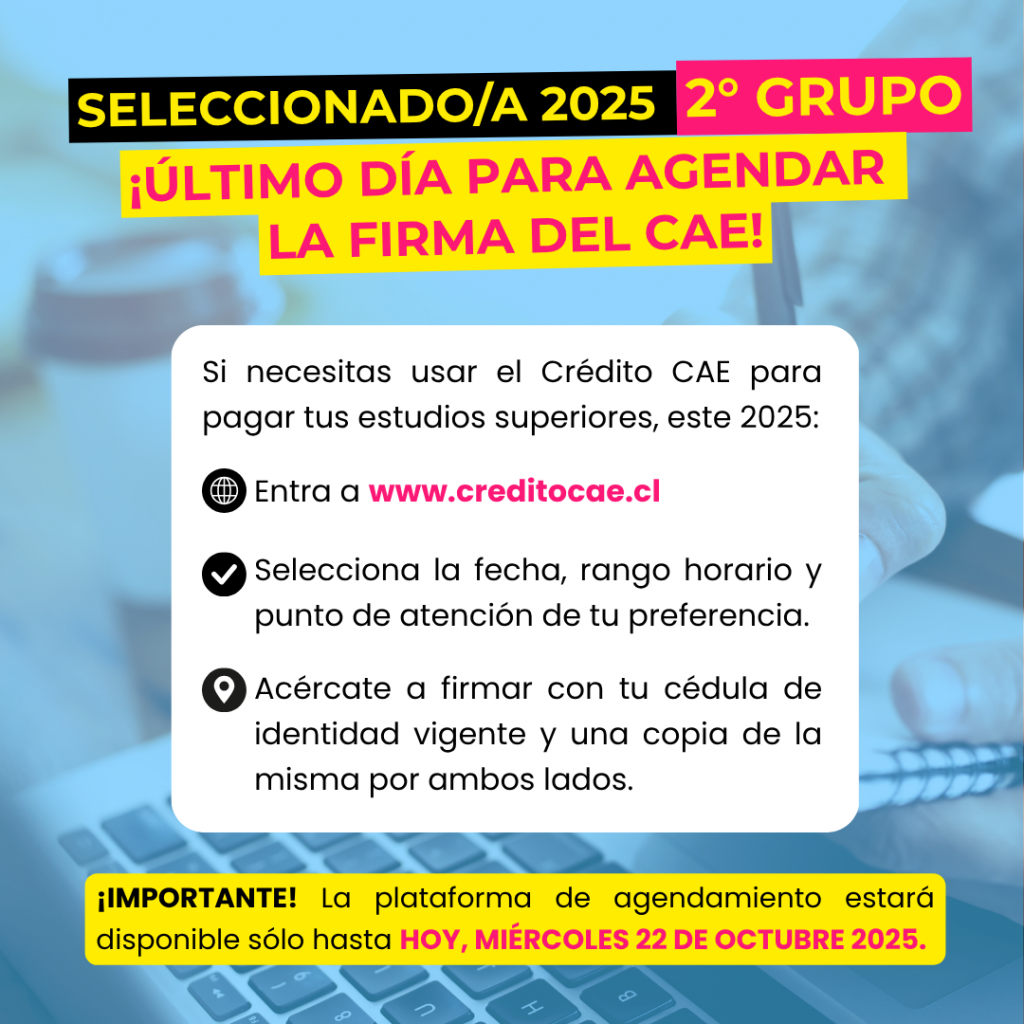 La Unidad de Financiamiento Estudiantil informa que el plazo para agendar la firma del Crédito con Aval del Estado (CAE) ha sido ampliado hasta el miércoles 22 de octubre de 2025.